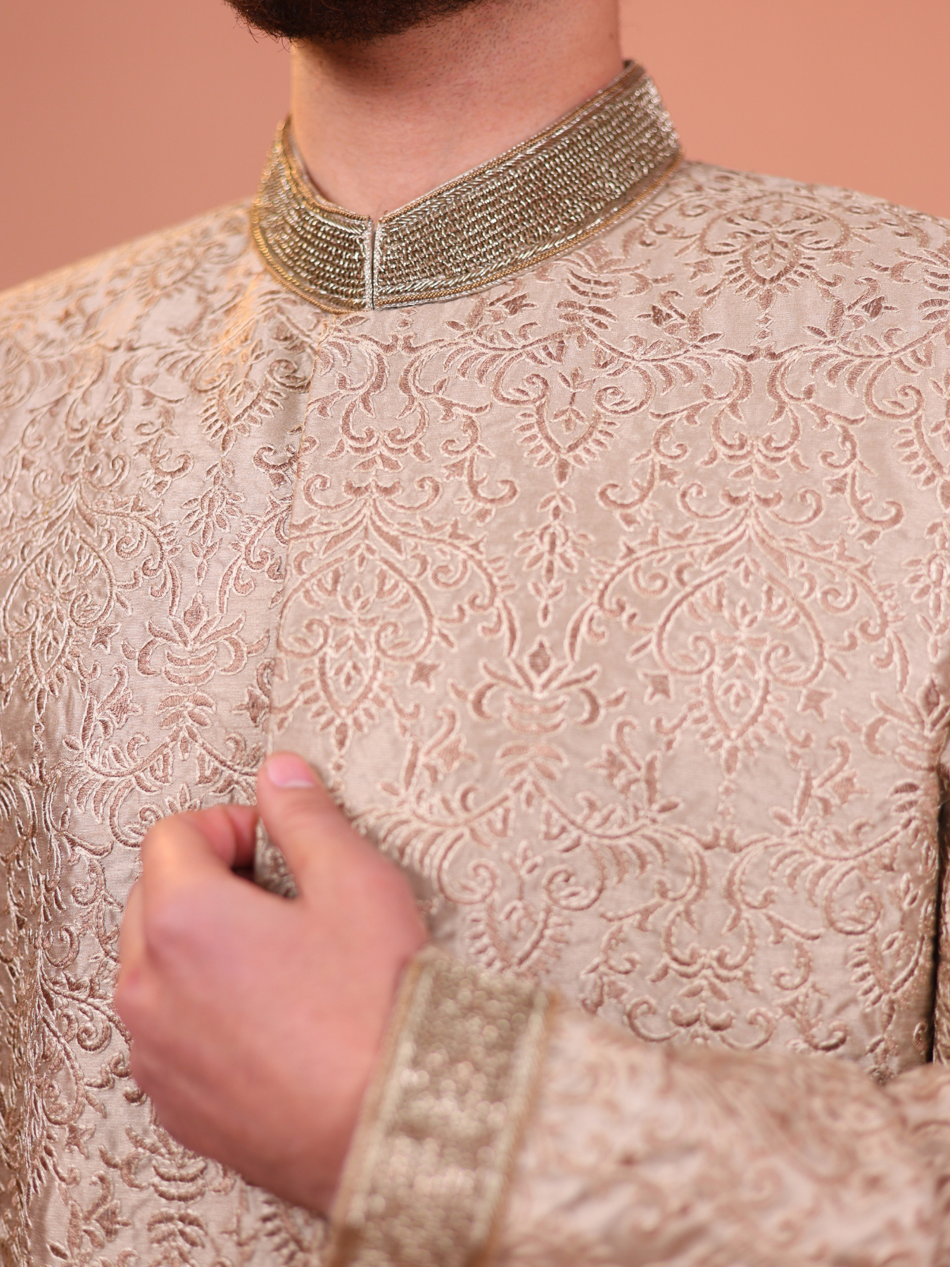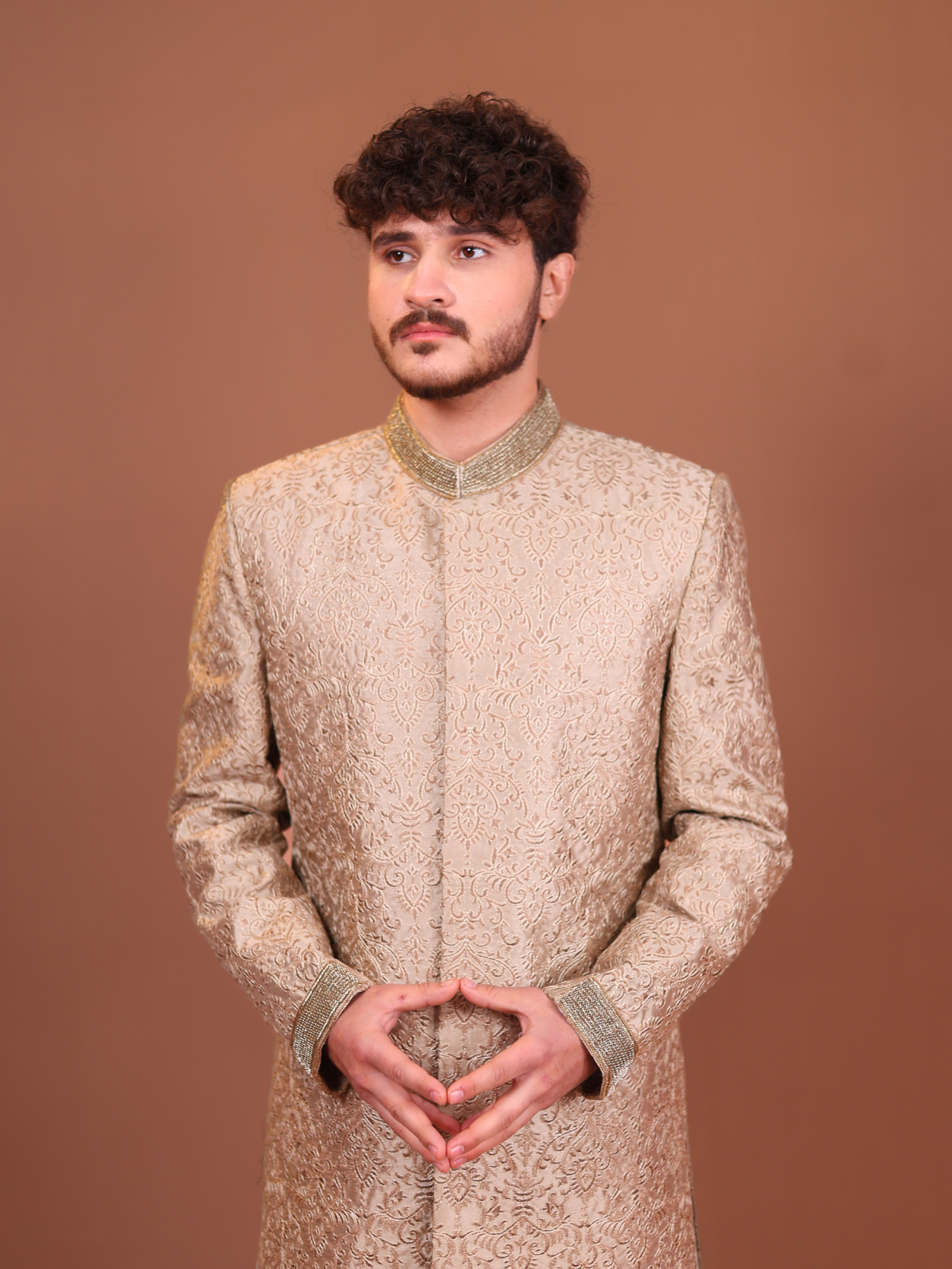 Timeless gold-textured sherwani, a masterpiece of sophistication and charm. Designed with intricate embroidery on luxurious fabric, this outfit exudes royal opulence. Paired with classic white trousers and traditional khussa shoes, this sherwani is a perfect choice for weddings or festive occasions.