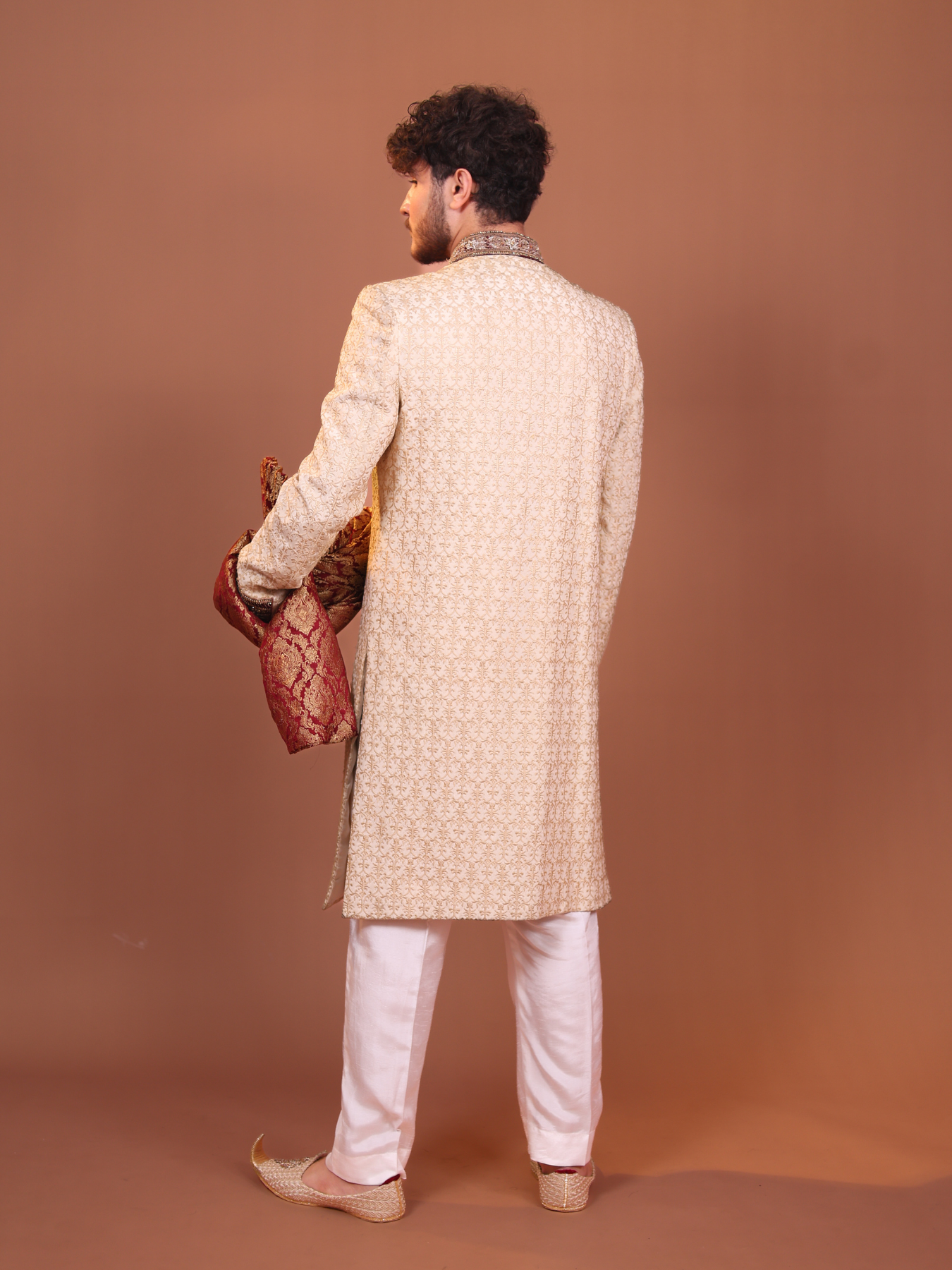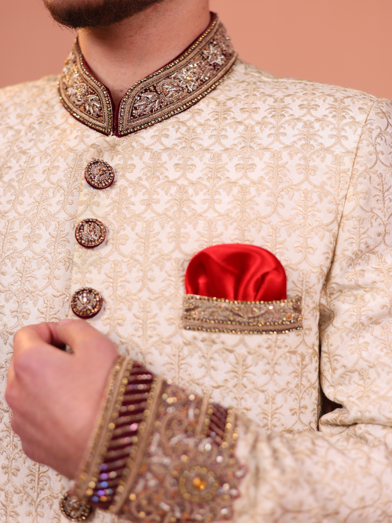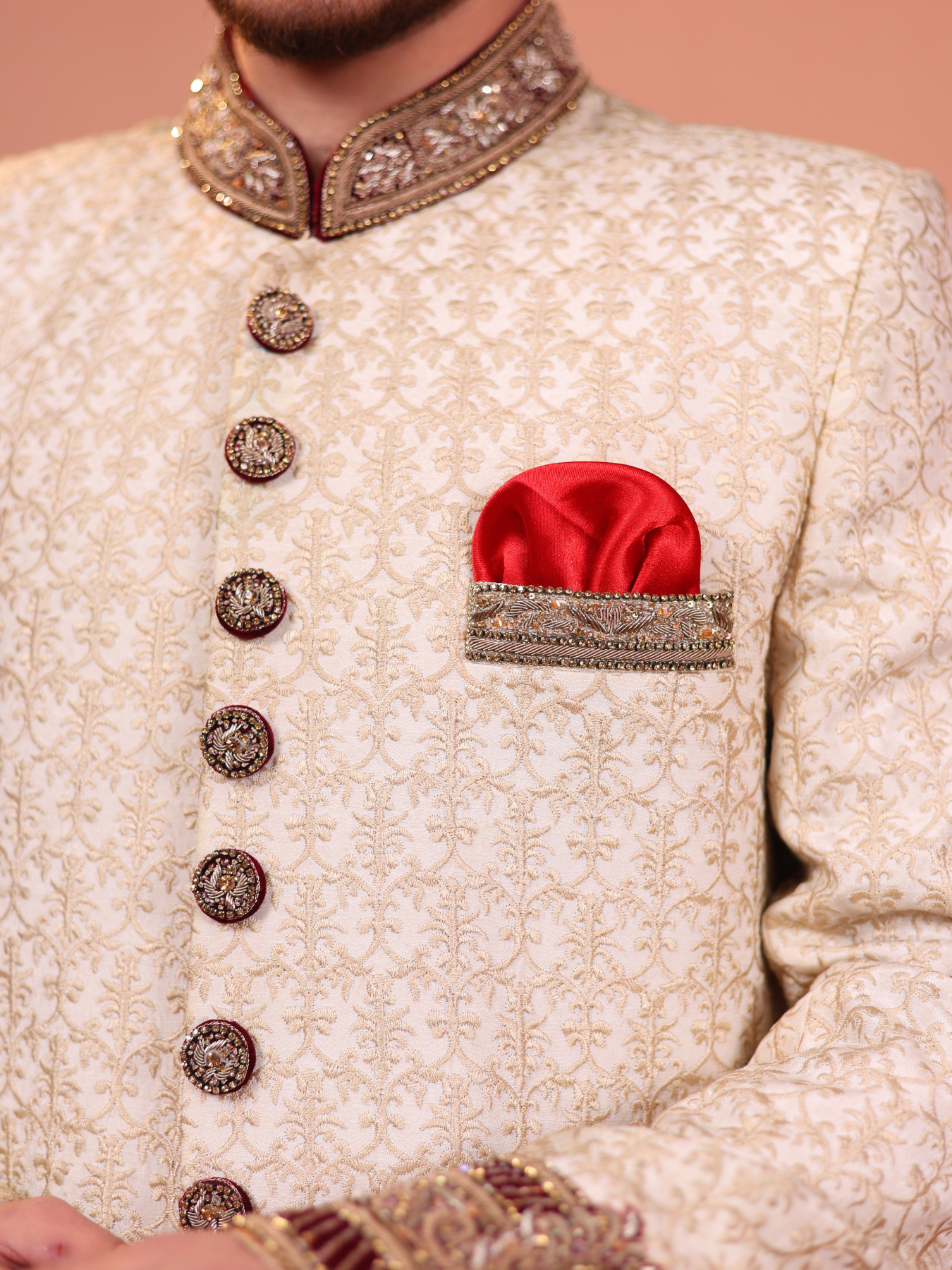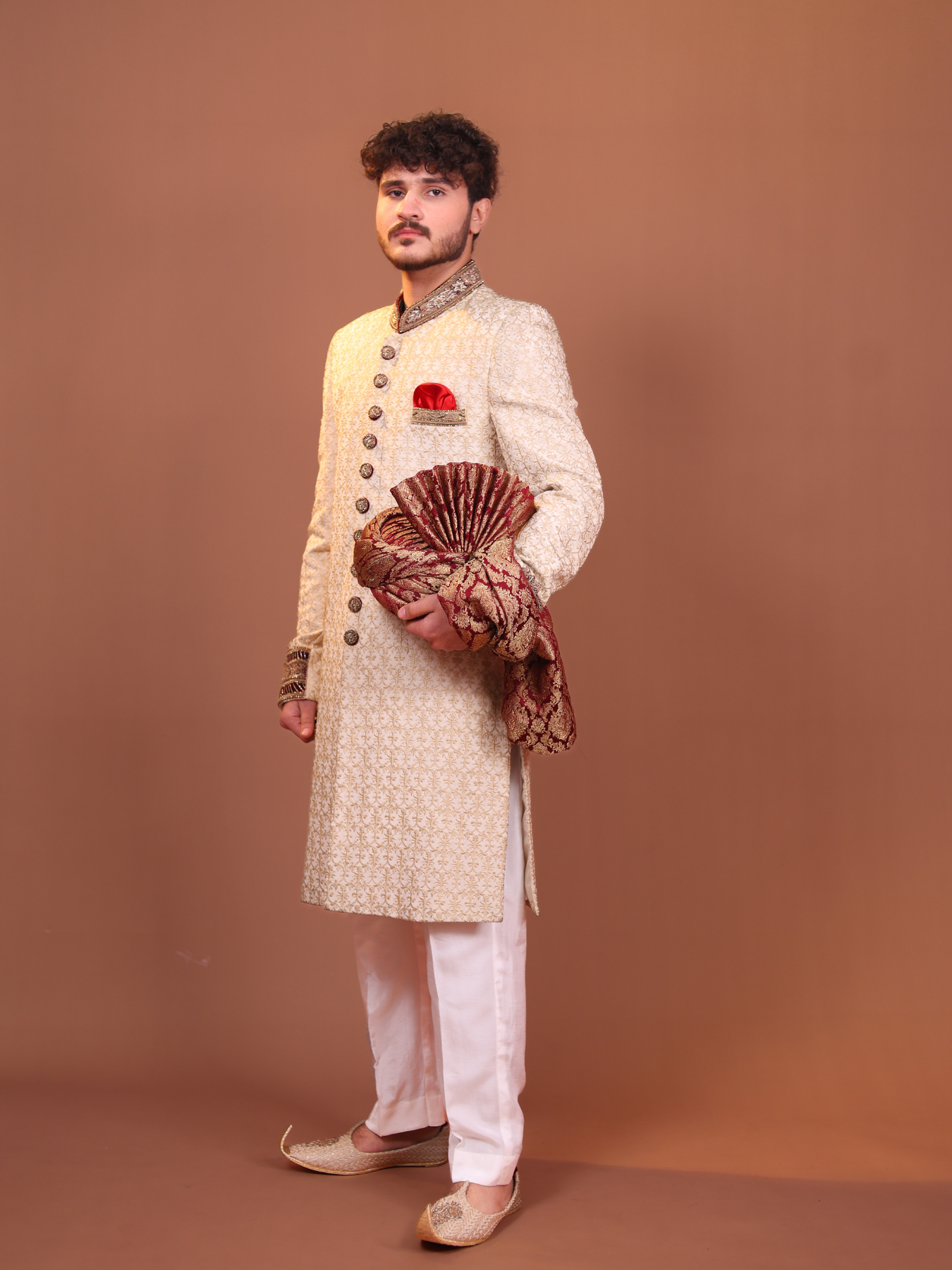 Ivory-gold sherwani, adorned with intricate embroidery and embellished buttons. Featuring a rich red pocket square and paired with a luxurious brocade turban in gold and red hues, this sherwani is the epitome of regal elegance.