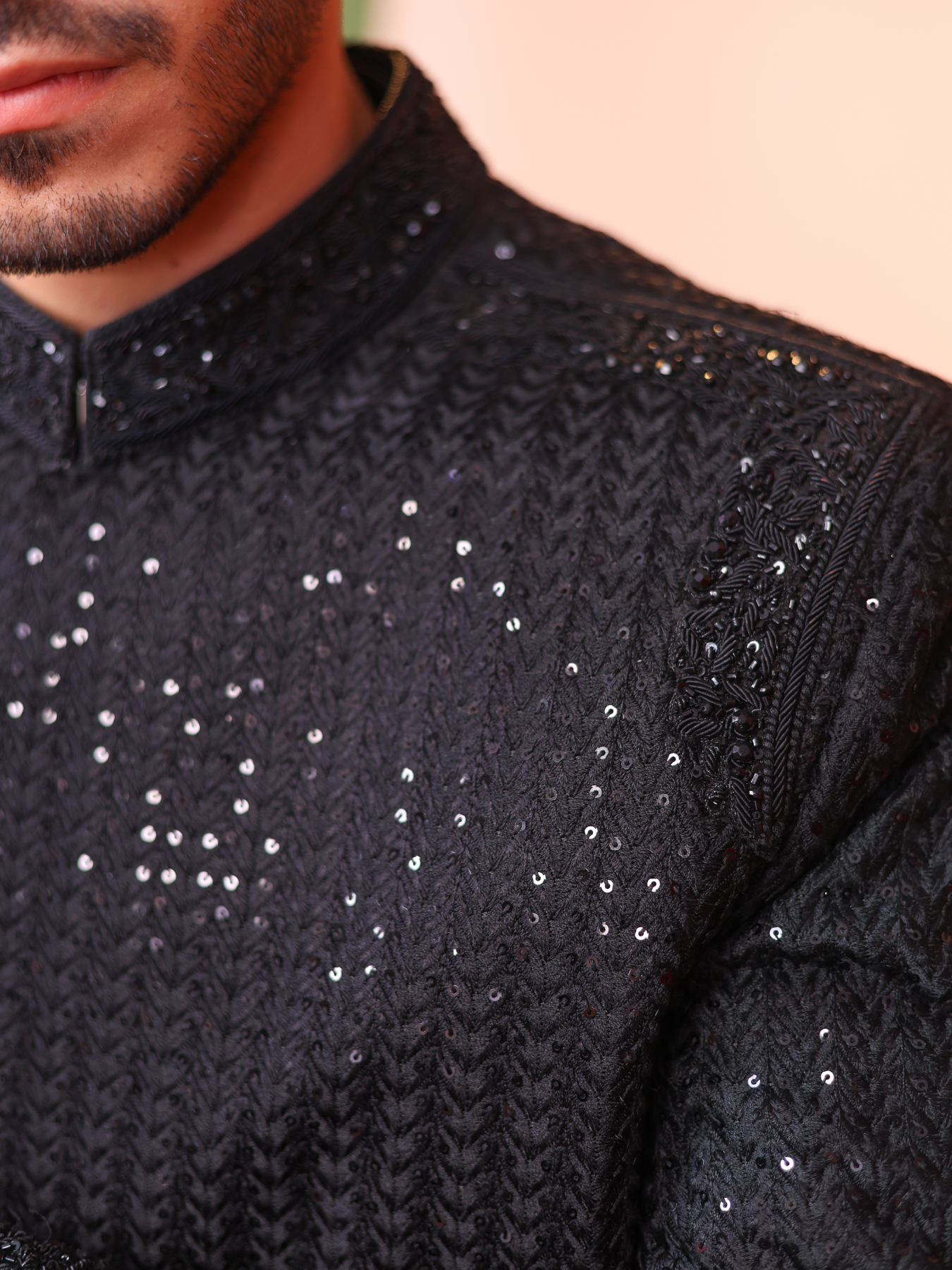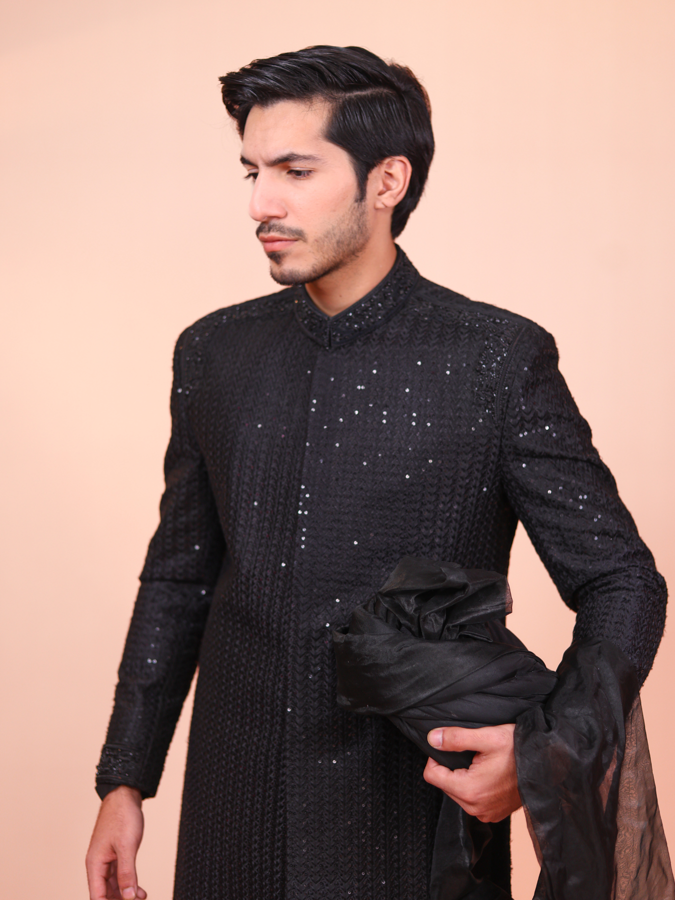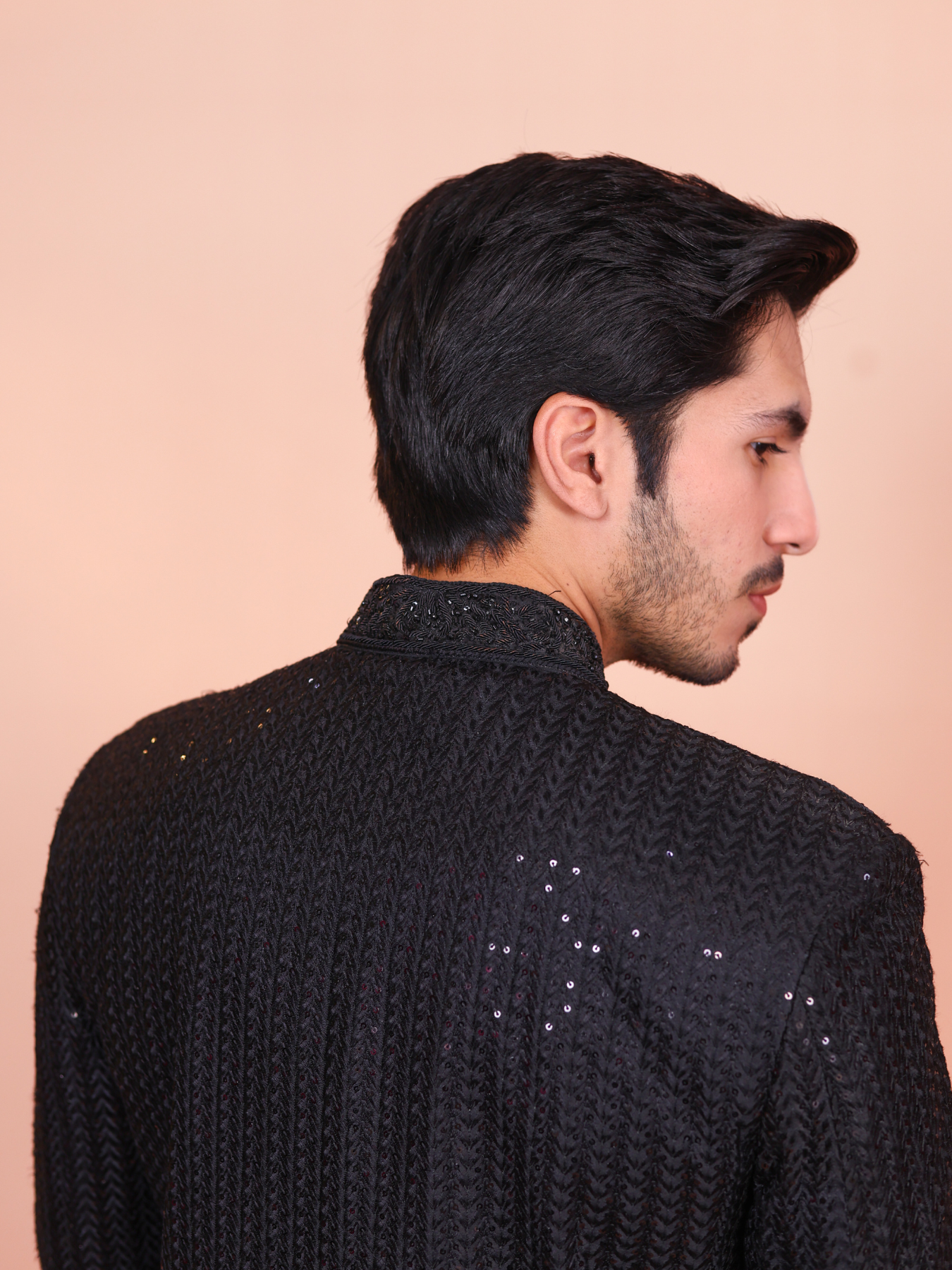 This sherwani exudes sophistication with its all-black design and subtle sequined detailing, giving it a modern and classy look. The textured fabric adds depth, while the sleek cut ensures a perfect fit. It's a perfect choice for grooms who want to make a bold yet elegant statement.