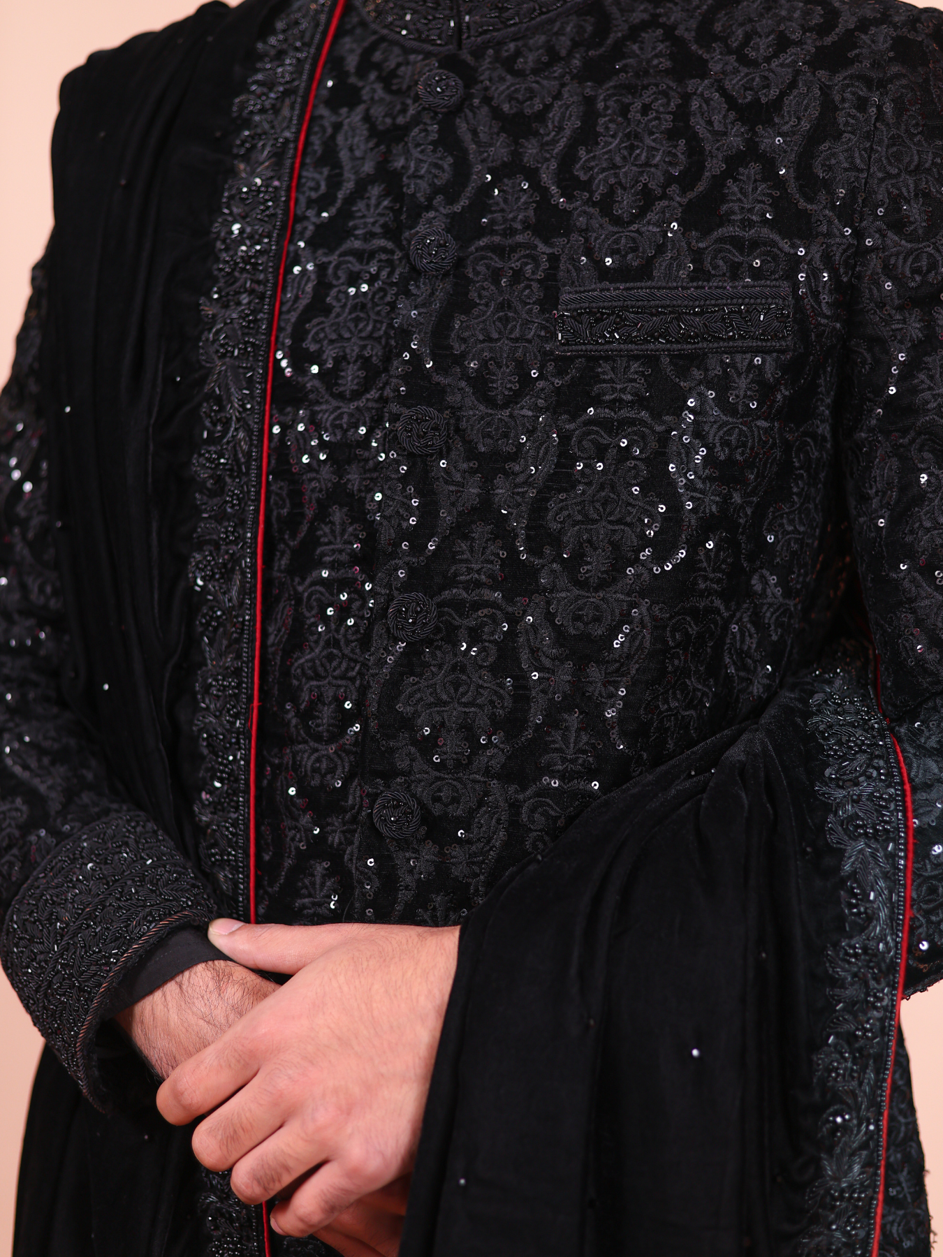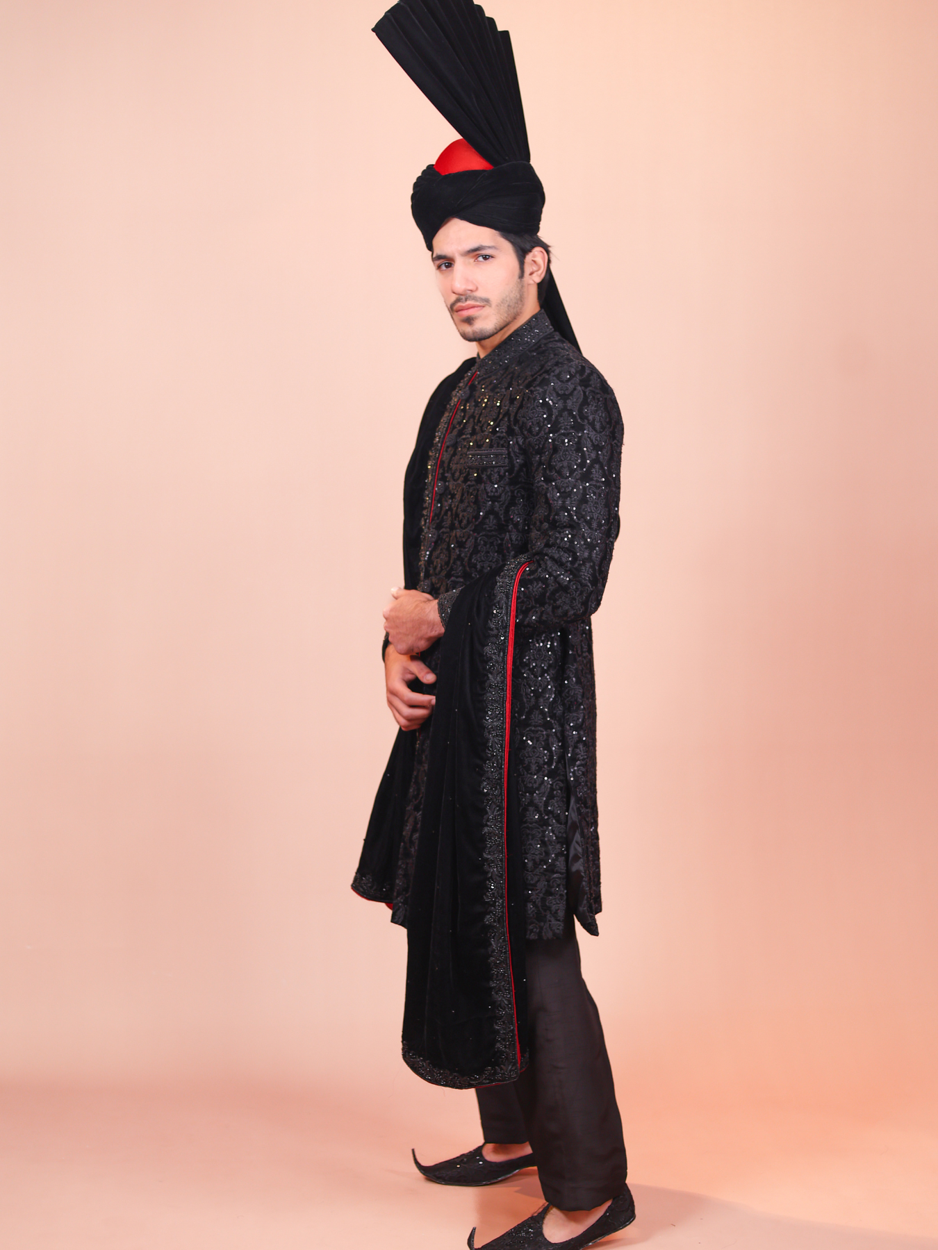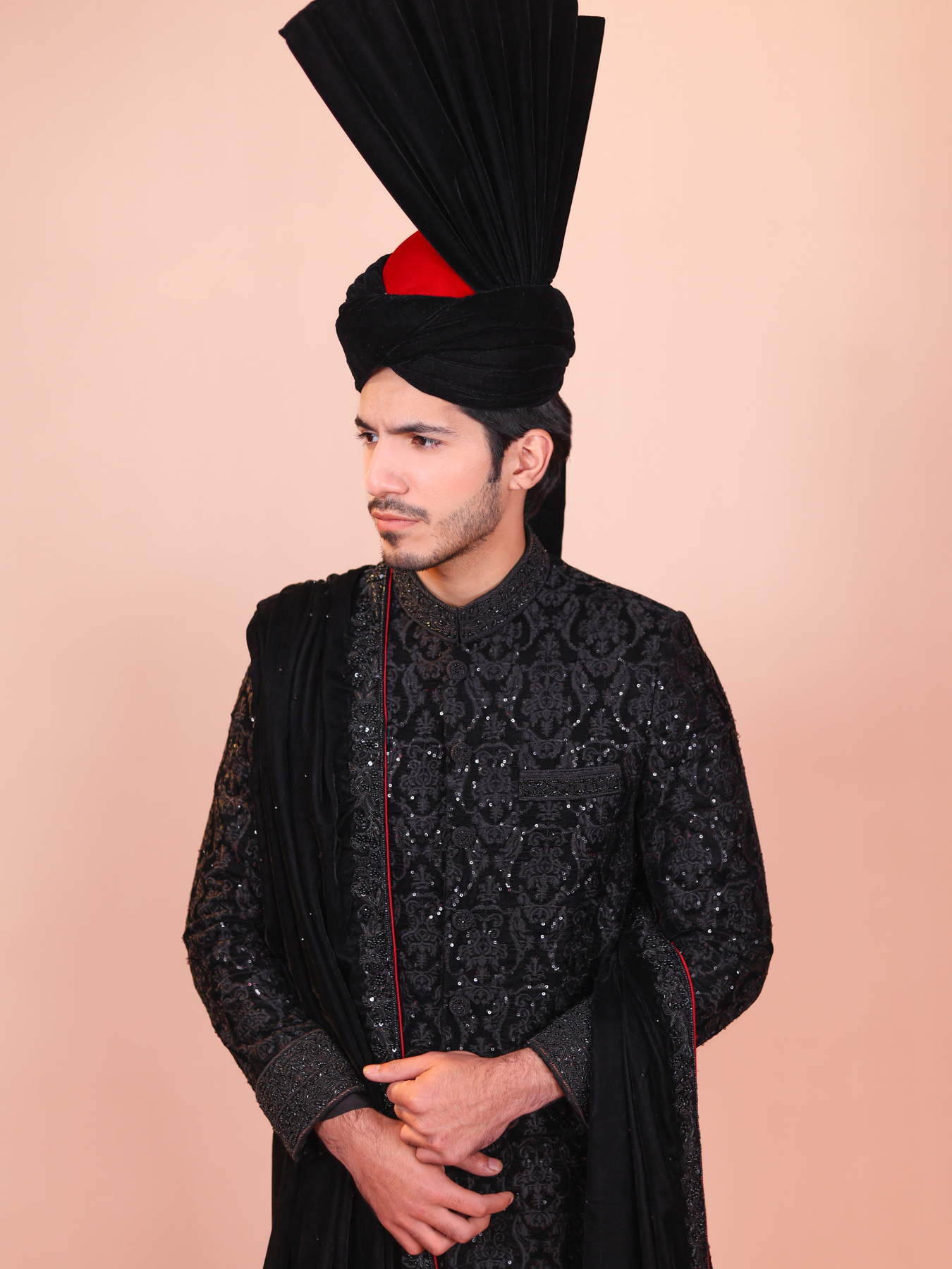 Command attention with this Royal Black Sherwani, designed to exude sophistication and elegance. The intricate embroidery paired with subtle sequins creates a perfect blend of traditional and modern aesthetics, while the statement velvet turban adds a touch of grandeur.